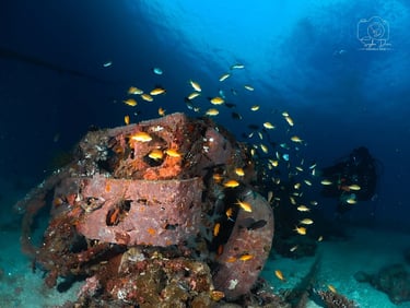 Henry arrived early, helped fill tanks, and even arranged a tricycle for our 3.5 km journey to the Medicare dive sites. I realized I forgot my booties halfway, and Henry dashed back to get them on his motorcycle. Lifesaver!